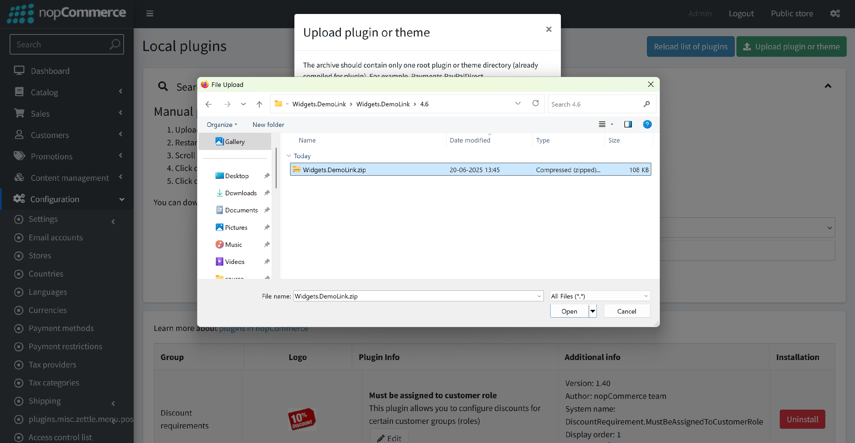 6. Select the .zip file named "Demo Link" and then upload it using the "Upload plugin or theme" button.
